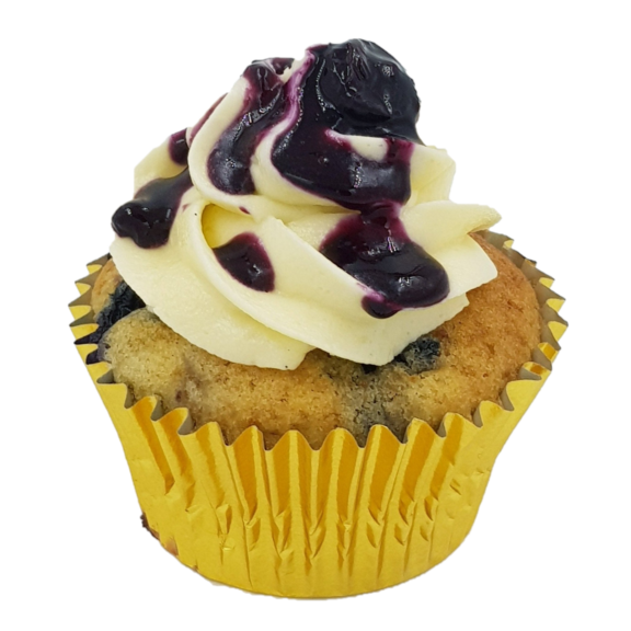 Vanilla cake base with fresh blueberries topped with Cream Cheese frosting and Blueberry Sauce